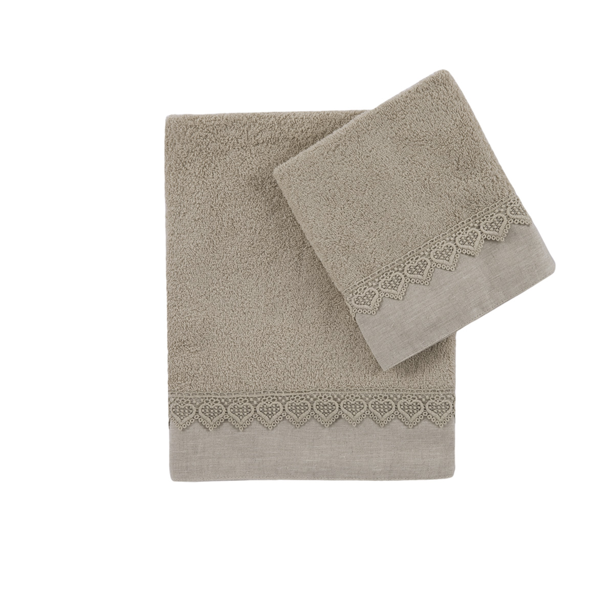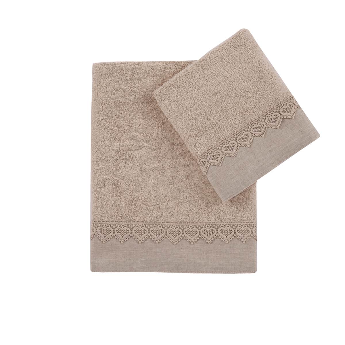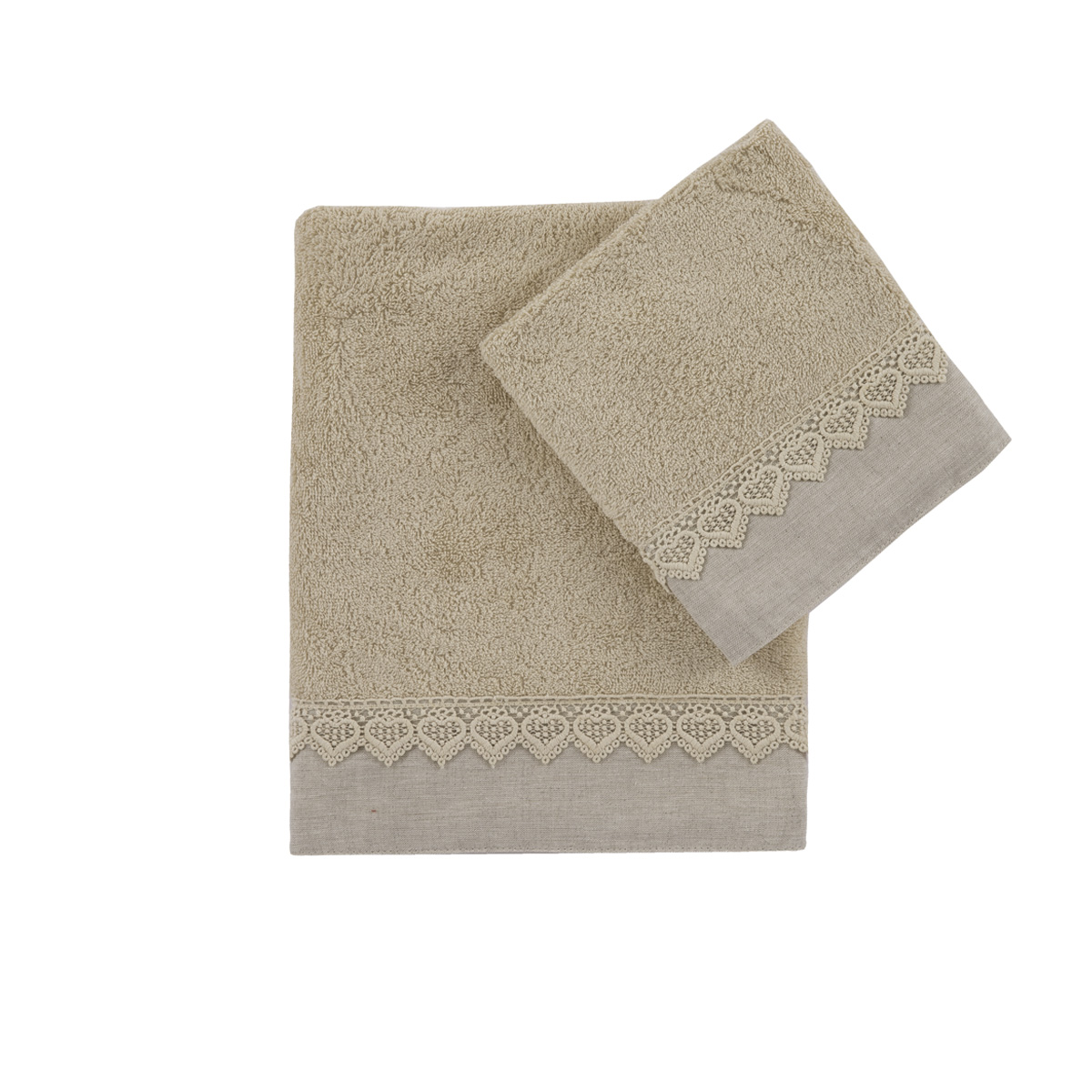 Elegante set di asciugamani per il bagno in morbida spugna con pizzo, racchiusi in una raffinata confezione.