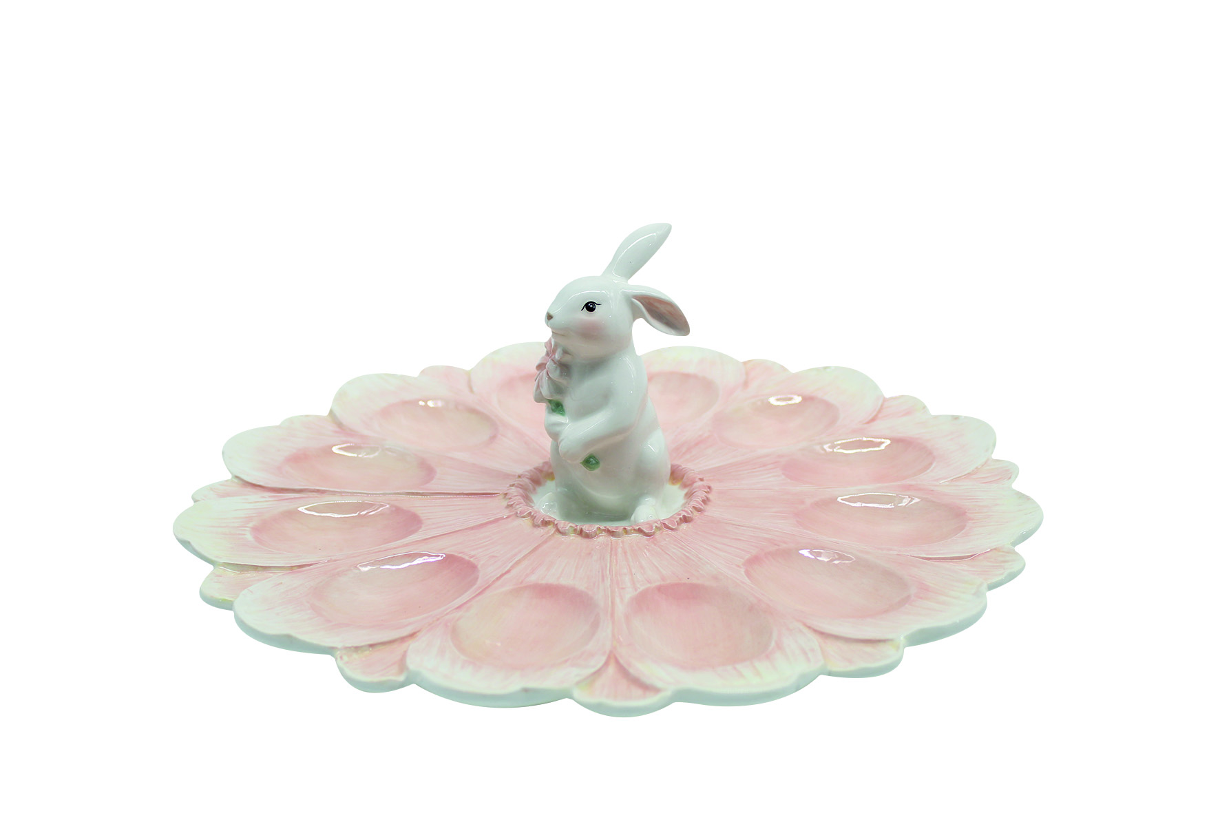 Vassoio decorativo in porcellana sfumato rosa a forma di fiore con coniglietta centrale